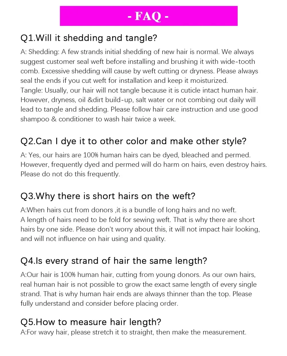 3.Natural color(the color is natural without processing),Silk,Smooth,Soft Touch and Tangle Free,Shedding Free,Can be Washed,Dyed,Permed,Curled,Straightened,Durable,Resuable,After Wash, It Return Same Texture.