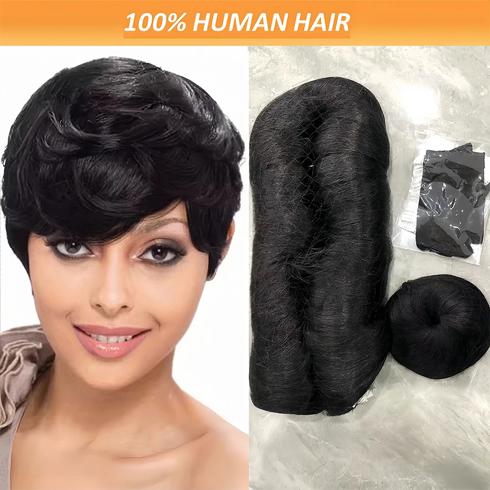 28PCS Brazilian Short Human Hair Extensions #1B One Pack For A Full Head 100% Human Hair Bundles With Free Closure Straight