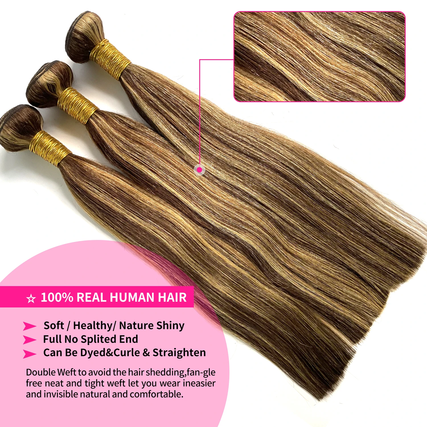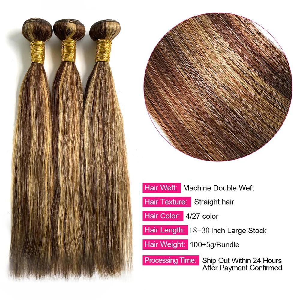 Brazilian Human Hair Bundles Extensions Honey Blonde P4/27 Straight Natural Hair Bundles with Smooth Texture Bundles Extensions