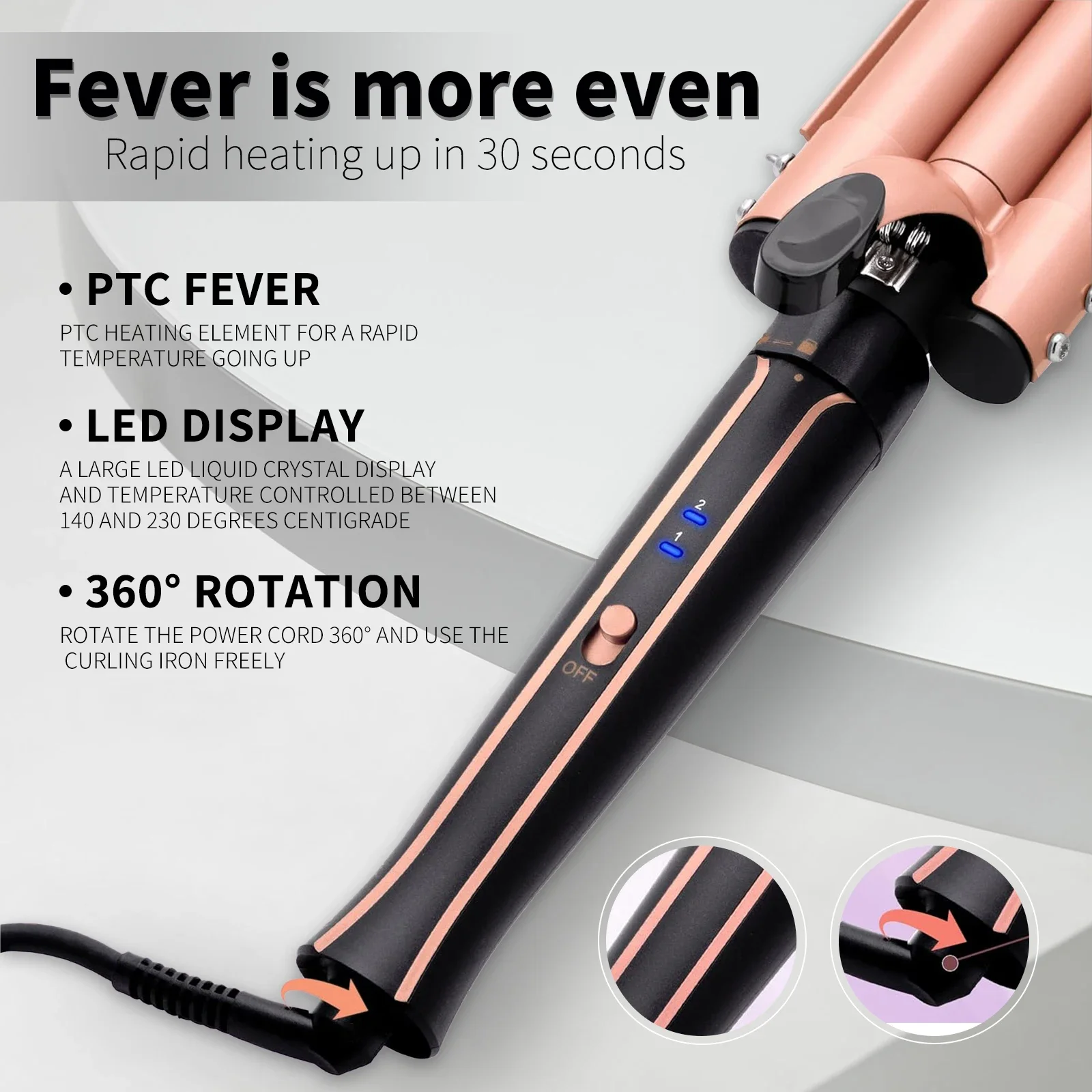 The three large ceramic barrels of our hair waver iron ensure your hair is given a natural-looking wave. The chunky size of the 3 barrel crimper hair iron means it can get through the hair quickly, taking just a few minutes to style all of the hair.