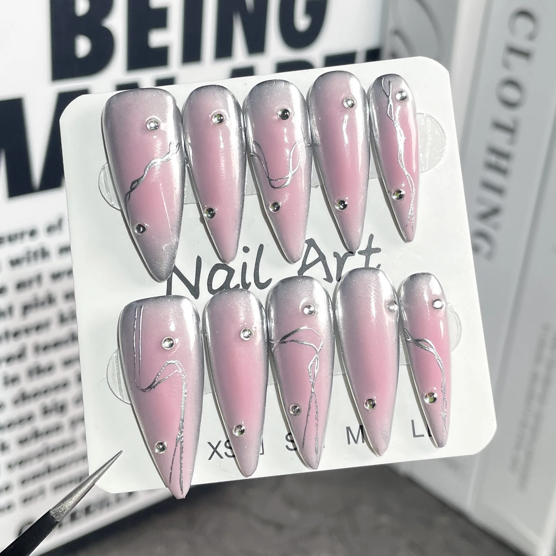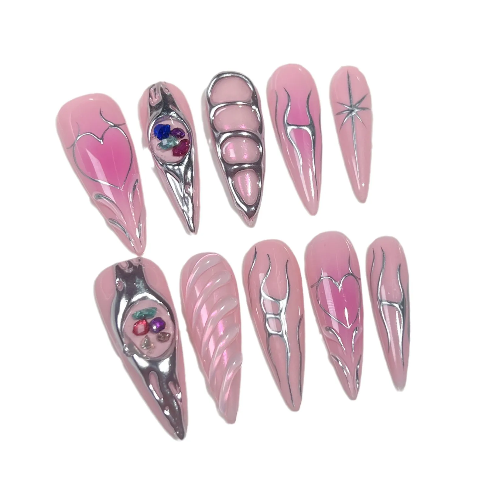 Handmade Press on Nails Sweet Cool Spice Girls Style Fake Nails Wearable Punk Metal European Long Almond False Nails for Girls