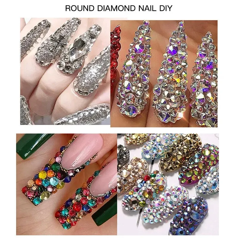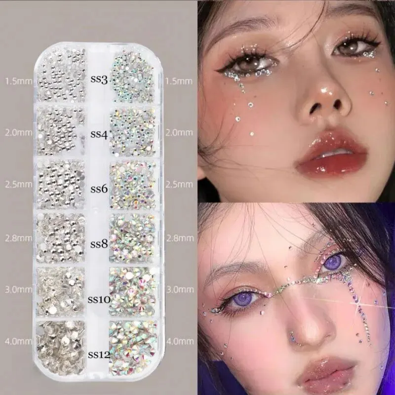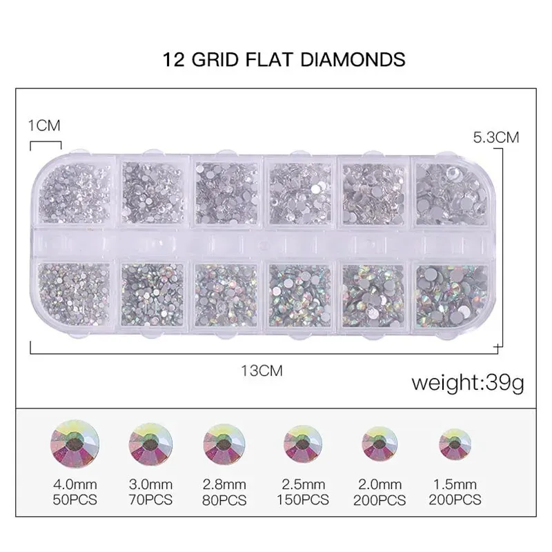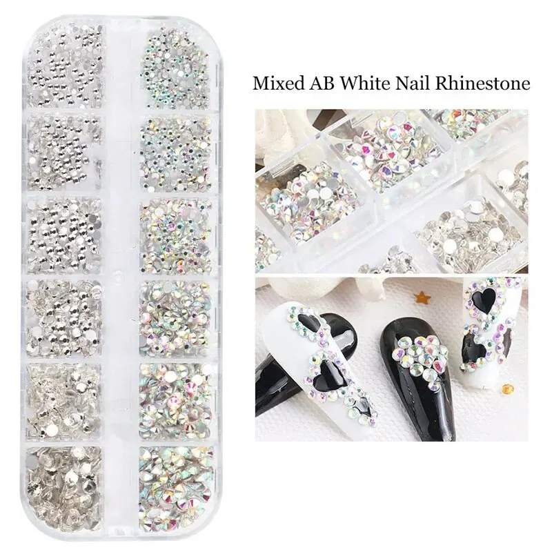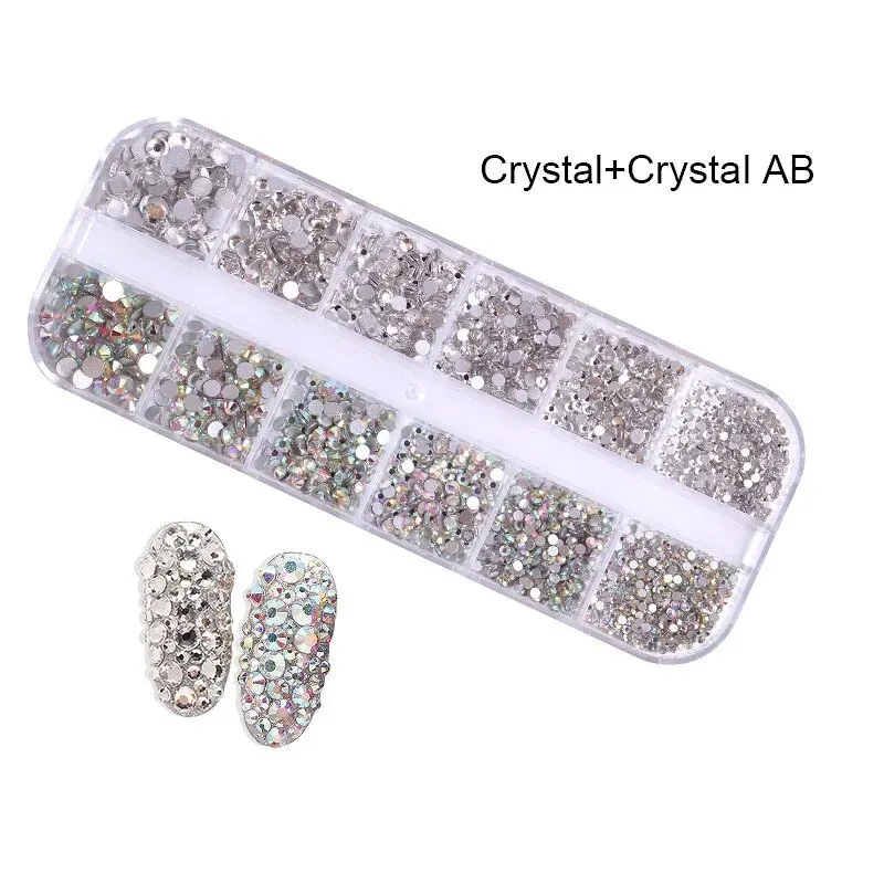 Nail Art Rhinestone 12Grids Box Nail Beads AB Crystal Flatback Stone Jewelry Gems with Storage Organizer for Nail Decorations