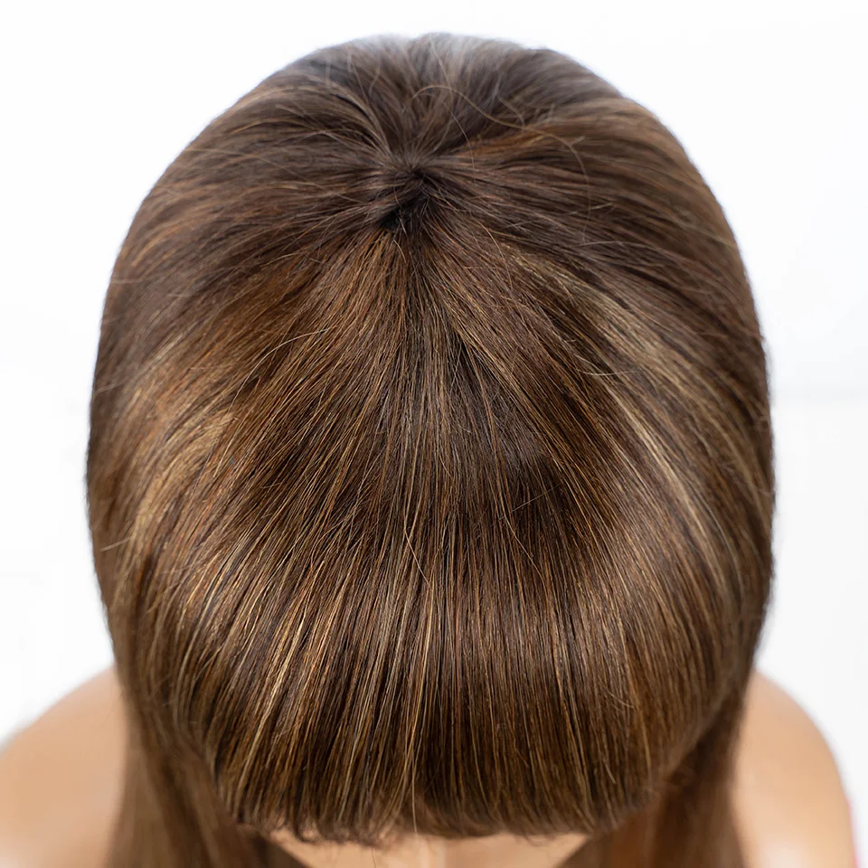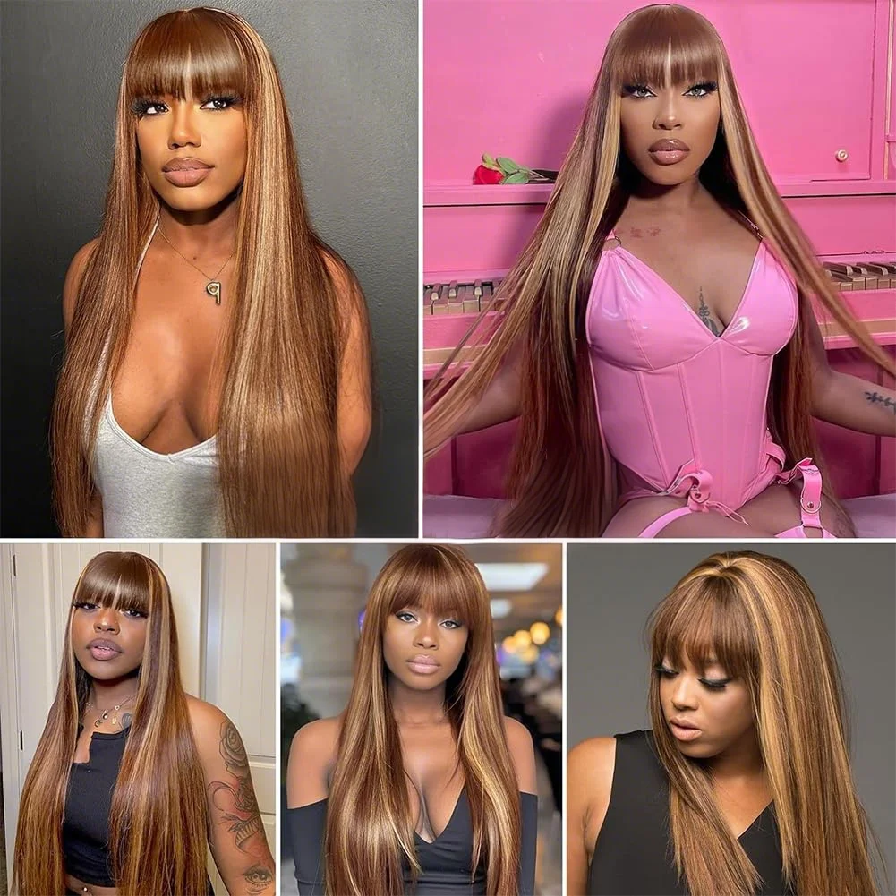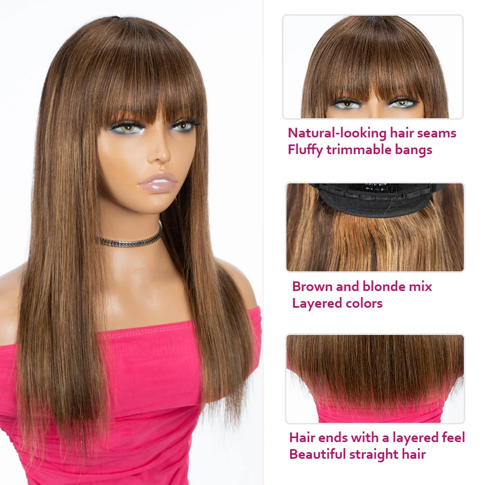 Ombre Brown Highlight Straight Human Hair Wigs With Bangs Wear And Go Glueless Colored Human Hair Wigs 16-28inches Straight Wigs