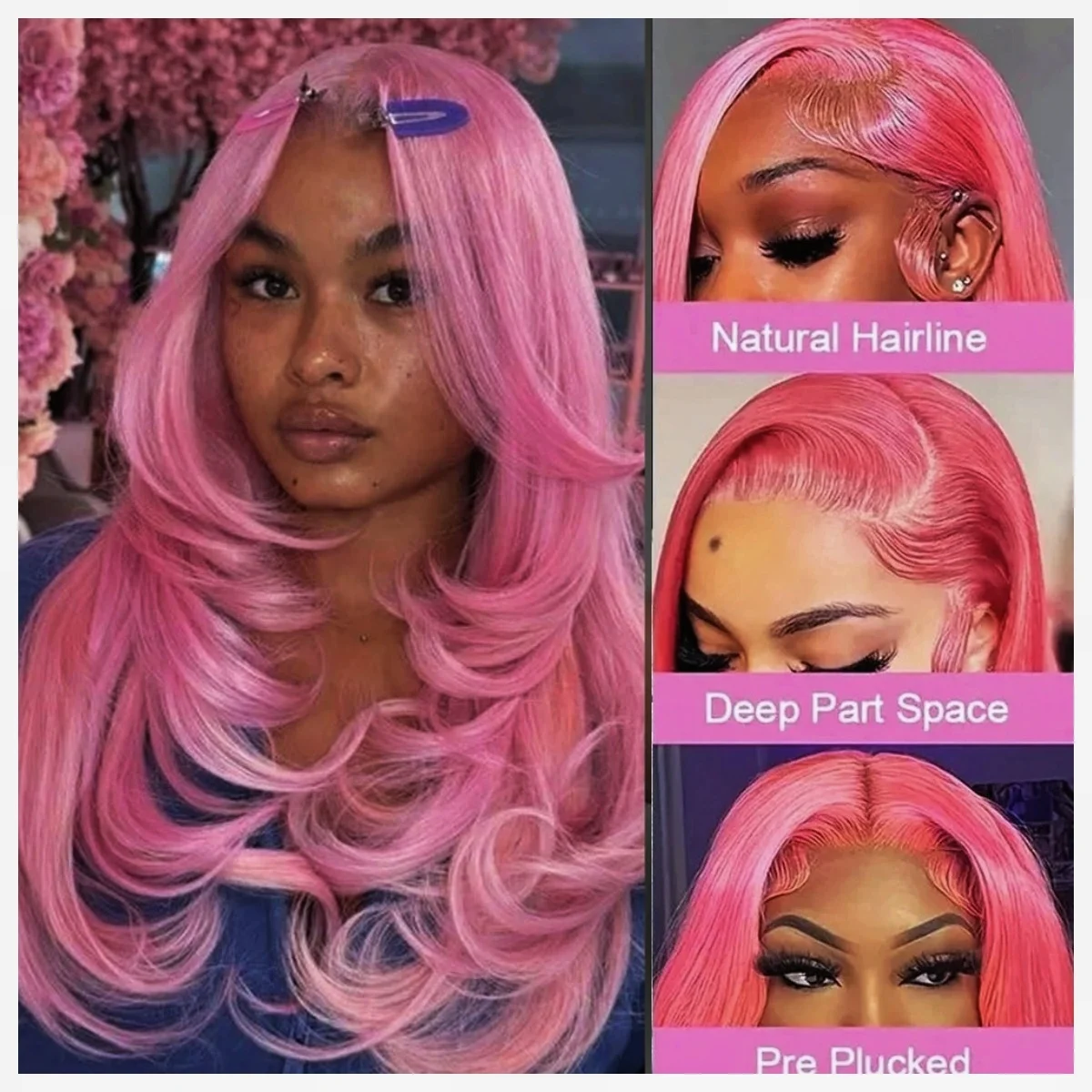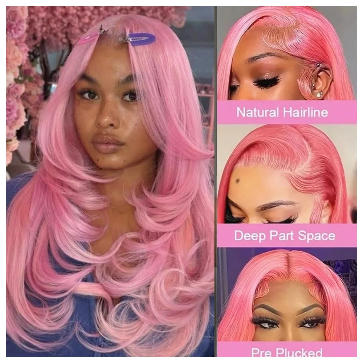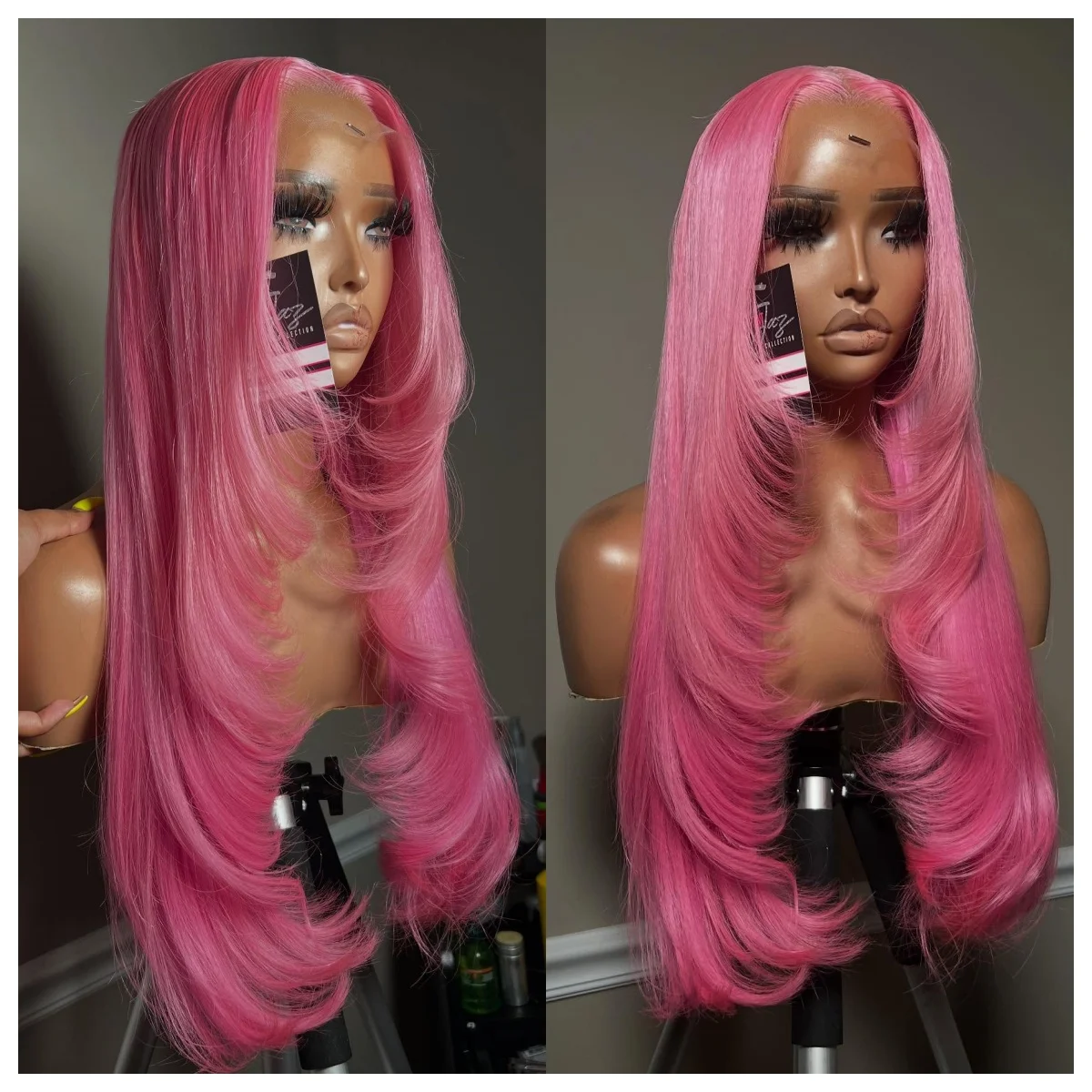 Pink Wig Layered Cut Bone Straight Lace Front Wig PrePlucked 13×4 HD Lace Frontal Wig Synthetic High Quality Daily Wear Cosplay