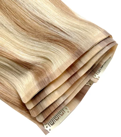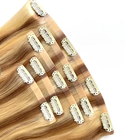 hair. Clips with silicon avoid sliding, and delicate handcraft create the anti-shedding hair extensions to win your customers’ appreciation. Each of Topelles clip-in hair extensions is made of the highest quality human hair with intact cuticle, which ensures that the hair can be dyed into light color and feels smooth when touched. |