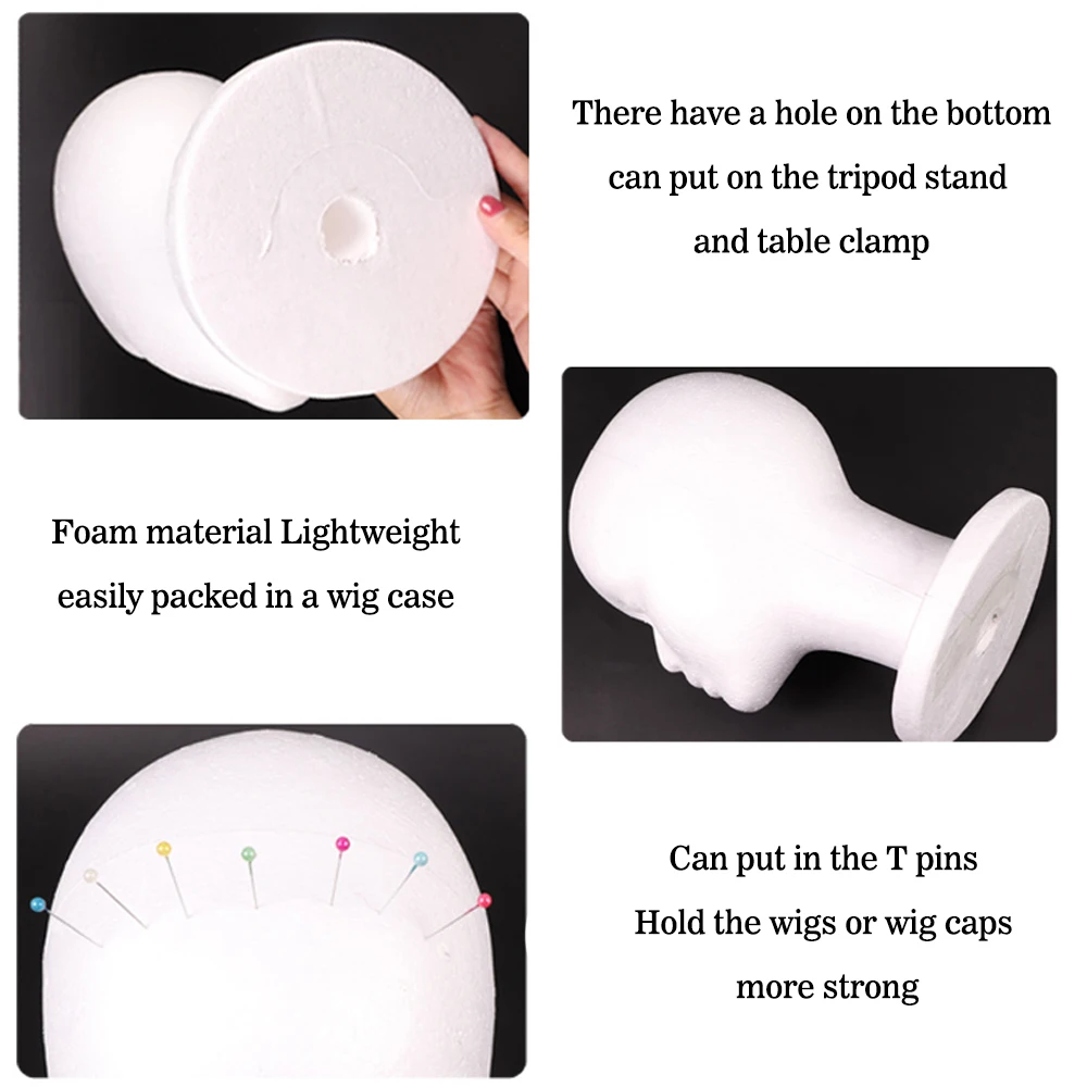 【Styling & Travel Clamp Companion】The foam styling head features a clamp hole at the bottom that fits perfectly on standard tabletop wig clamps and wig box clamps to keep your wig firm as you wash, cut, and style